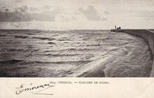 N° 2604. - Ostende - Coucher de soleil. - Het Weststaketsel en het klein strand hoog water