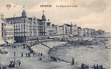 De Zeedijk ten westen van het Kursaal, richting het Koninklijk Chalet. Rechts, het groot strand en de traditionele badkarren