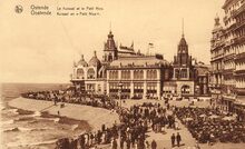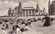 Oostende in de Belle Epoque. Strandrecreatie op het Groot Strand. De westelijke gevel van het derde Kursaal langs de Zeedijk