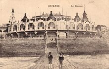 Lauwers, N° 9. - Kursaal vue du coté. - De noordgevel van het derde Kursaal langs de Zeedijk. Kinderen spelen op het Groot Strand nabij de golfbreker