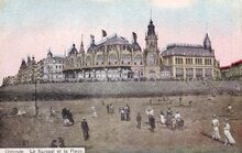 Le Bon, éditeur, Ostende, N° 11, Ostende - Nouveau Kursaal. - Twee kaarten, één bijgekleurd. - Strandrecreatie op het Groot Strand nabij de westelijke gevel van het derde Kursaal langs de Zeedijk