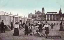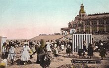 Arfo. - De westgevel van het derde Kursaal langs de Zeedijk. Het is druk op het Groot Strand