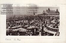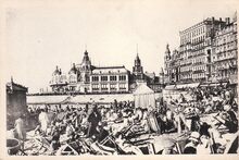 Ostende, vue sur la plage. - Bijgekleurd. - Strandrecreatie op het "groot strand", met links de luxe badkarren. Zicht op de Westgevel van het derde Kursaal.