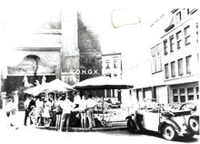 Foto van een gedeelte van een praalwagen van een Karnavalstoet genomen op het Leopold I plein met Café Melrose op de achtergrond.