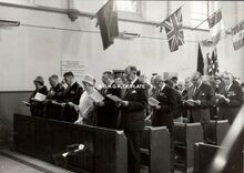 Formaat : 11,5 x 16 cm. - Foto van binnenzicht van Anglicaanse kerk met personaliteiten gedurende een kerkelijke plechtigheid (o.a burgemeester Serruys en schepen Lauwereins).