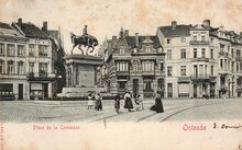 Ostende. Monument Léopold. Gedeelte van het plein gelegen, tussen de Torhoutsesteenweg en de Kemmelbergstraat. Gevelopschrift : Café Nouveau Auto Garage. Chez E. Vanderjeugd. Gemeenteplein. Kreeg pas later de naam Leopold I-Plein.