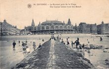 Walschaerts, N° 84. - Ostende - Le Kursaal pris de la Plage. The Casino taken from the Beach. - De noordgevel van het derde Kursaal gelegen langs de Zeedijk. Vooraan, het Groot Strand en de golfbreker bij laag tij. De glibberige golfbreker is nog altijd een attractie. Hier voor spelende kinderen maar ook een volwasene is nieuwsgierig. Links, op de achtergrond de Kursaal-Oosthelling en rechts, de grote hotels