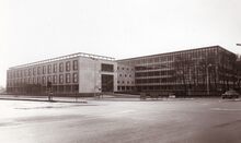Foto vanop Troonstraat achtergevel complex Katholieke Industriele Hogeschool voordien "Institut des dames du Sacré Coeur";