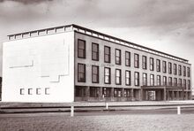 Foto genomen vanop de Leopold III-laan van de zijgevel van het stadhuis (kant rondpunt), het basreliëf met het stadswapen door beeldhouwer August Michiels is nog niet aangebracht;