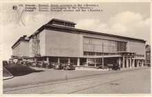 De zuidgevel met de hoofdingang van het vierde Kursaal gelegen langs de Van Iseghemlaan en links, de Westgevel langs de Kursaal-Westhelling. Gebouwd naar de plannen van Leon Stynen.