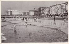 Strandrecreatie op het groot strand. Rechts, de Albert I-Promenade en op de achtergrond, de westgevel van het vierde Kursaal