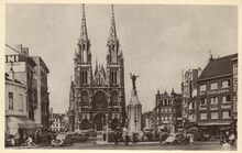 Zicht op de Sint-Jozefskerk vanuit de Rogierlaan. Op de voorgrond de tramsporen van de eerste stadstram, een stoomtram. Let op de ijscokar.
