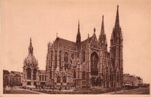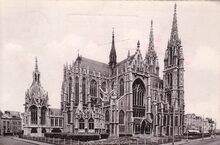 De kerk gezien vanuit de Jozef II-straat. Links, de Koninginnekapel met het praalgraf van de eerste Belgische koningin Louise-Marie