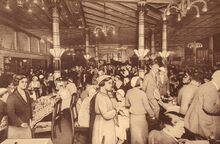 Veel wandelaars op de Zeedijk, het Groot Strand met de badkarren en op de achtergrond het Derde Kursaal tijdens de Belle Epoque.