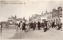De traditionele badkarren op het groot strand, de grote hotels langs de Albert I-promenade. Op de achtergrond, de westgevel van het derde Kursaal