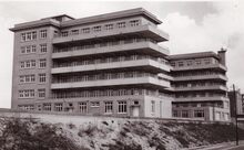 Zij- en achtergevel van het sanatorium Sint Vincentius à Paulo (Instituut Delcroix). Het instituut werd bestuurd door de Dochters der Liefde van Vincentius à Paulo tot 1969. Foto genomen uit de richting van de Raversijdestraat.