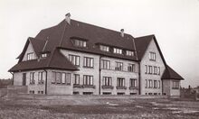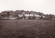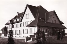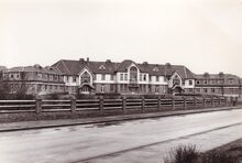 Foto vanop Dr. E. Moreauxlaan voorgevel Tehuis GODTSCHALCK , dr. E. Moreauxlaan nr. 322,met rondwandelende bewoners van dit tehuis.