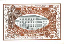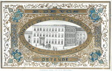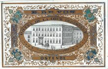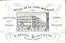Formaat : 6,1 x 9,3 cm. - Hôtel de la Cour Impériale. E. De Vos Ostende. Rue de la Chapelle. Table d'hôte à 1 & 5 heures. Diners à volonté. Op verso Chemin de Fer Départ d'Ostende à. . Het hotel was gelegen op de hoek van de Kapelle- en de Sulferpriemstraat. Sulferpriemstraat = Rue des Allumettes, het gedeelte van de huidige Ooststraat tussen de Aartshertoginne- en de Kapellestraat. In 1827 breidde brouwer Jean zijn herberg uit tot "Hôtel de la Cour Impériale". Andere benamingen zijn "Cour Impériale", "Ter herberge La Cour Impériale", "Het Keizerlijk-Hof".