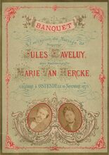 Banquet a l'occasion du Mariage de Monsieur Jules Daveluy avec Mademoiselle Marie Van Hercke célébré à Ostende le 16 Novembre 1875.