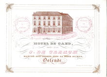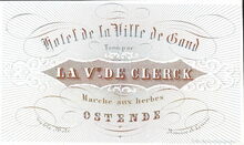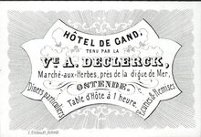 Formaat : 4,1 x 6,1 cm. - Hôtel de Gand tenu par la Vve A. De Clerck. Marché-aux-Herbes, près de la digue de Mer, Ostende. Table d'Hôte à 1 heure. Dîners particuliers. Ecuries & Remises.