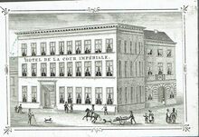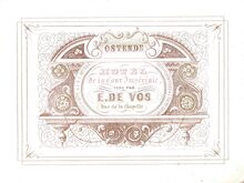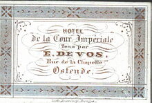 Hôtel de la Cour Impériale. E.De Vos Ostende. Ce bel Etablissement avantageusement connu depuis nombres années situé au centre de la Ville à proximité de la station de chemin de fer et des Bains de mer .Vient d'être nouvellement restauré et décoré.Il offre ainsi toutes les commodites de cables.Table d"hôte à 1 et 4 1/2 heures .Grands et petits appartements .Vastes remises et Ecuries. This superior Establishment the reputation of which has been for many years so well established,situated in the centre of the town and in the immediate proximity of the Rail Road and the Sea Baths, has been recently newly fitted up and highly embellished and beautified.It offers therefor to the Traveller and Visiter every desirable accomodation.Table d'hote at 1 and at 1/2 past 4 o'clock.Privat appartements Extensive Stallings and Coachhouses.