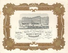 Formaat : 17,5 x 21,2 cm. - Hotel D'Allemagne tenu par Wagner & Mertian à Ostende. - En face de la station et à proximité des bateaux à vapeur. - Table d'hôte à 2 et 5 heures. - Deutscher Hof dem Bahnhofe gegenüber u. nahe an dem Landungsplatze der Dampfschiffe. - German Hotel opposite the Station et naer (sic near) to the Custum house.