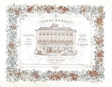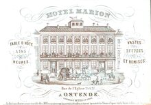 Formaat : 17,7 x 22,6 cm. - Hotel Marion. Rue de l'Eglise 26 & 27 à Ostende. Commerce de vins en gros. Table d'Hôte 1 & 4 heures. Vastes écuries et remises. Cet Hôtel nouvellement restauré & meublé offre à M.M.les Voyageurs tous les avantages désirables se trouvant à proximité des Bateaux à Vapeur & de la Station du Chemin de Fer etc.