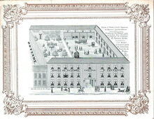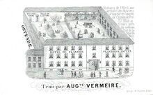 Cet hotel nouvellement décoré et meublé situé dans le plus beau quartier de la Ville pres la grand place et à proximité de la dique de mer, offre à messieurs les Voyageurs tous les avantages désirables. Table d'Hôte, Diners particuliers à toute heure. Les remises et écuries sont vastes et saines. / This very superior establishment situated in the finest part of the town near the great square and sea Dike (tekst niet leesbaar) every accommodation for families visiting the continent. An odinairy every day. Private dinners may be had at any our. Exxellent Coach-houses and Stabling.