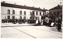 16 foto's z/w, formaat : 14 cm x 9 cm. in album. - Plechtigheid op de trappen van het dienstdoend stadhuis, huidig Gerechtshof. De minister van landsverdediging Etienne De Greef geeft het Oorlogskruis aan de stad Oostende. Bij Koninklijk Besluit van 31 maart 1951 is aan Oostende het Oorlogskruis met palm toegekend "Uit erkentelijkheid voor het schoon gedrag en de uitzonderlijke moed door de bevolking aan de dag gelegd tijdens de bombardementen van de stad in 1940". Nadien was er een lunch in het Thermen Hotel. De man met bril, rechts vooraan is burgemeester Henri Serruys. De zeemachtofficier die groet is de stafchef van de Zeemacht, commodore Georges Timmermans. Rechts, een trapje hoger is de stadssecretaris Michel Surmont. Achteraan rechts, herkennen we ook Adolf Van Glabbeke en Henri Smissaert. Links van de burgemeester een trapje hoger is de provinciegouverneur van West-Vlaanderen, Pierre van Outryve d'Ydewalle.