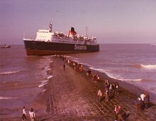 5 foto'sΒ in kleur : 13 x 10 cm.. De "Vortigern" strandde op een golfbreker ter hoogte van de Vlaanderenstraat. Het vaartuig werd op 6 maart door vijf sleepboten van de "Unie van Reddings- en Sleepdiensten" vlot getrokken.