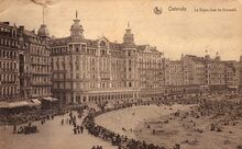 Zwart/wit foto Antony 10929-20. - Formaat : 24 x 30 cm. β Majestic Palace, Hotel du Kursaal en Beau Site op deΒ Zeedijk gezien van op het strand. Op de gevel van het Majestic Palace stonden ter hoogte van de tweede verdieping engelen in gips als gevelornamenten. Op de linkerhoek van het dak nog een klein bouwwerk (?)