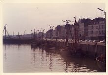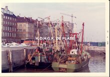 Formaat :Β 18 x 13 cm. - Enkele vissersvaartuigen in de Visserskreek. Links het CarferrygebouwΒ en aan de overkant van de havengeul, de hoogzeemijnenveger M.909 "F. Bovesse"