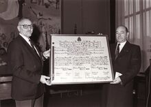 FormaatΒ : 9 x 12 cm. - De fanfare met vaandelΒ op de trappen van het GerechtshofΒ (toen diensdoendΒ als stadhuis). Ontvangst ter gelegenheid van het 50 jarigΒ lidmaatschap van Arthur Vanhoutte, Evarist Vandenbroele, KarelΒ Deschacht en Constant Schotte. De mevrouw met de bloemen is de echtegnote van Arthur Vanhoutte. Links naastΒ haar, burgemeester Henri Serruys.Β Uitgebreide beschrijving in : Zo was MariakerkeΒ : deelΒ II / Marc Casier. 2010, p.311. Plate Bib A321