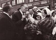 De minister krijgt een garnaal toegestopt door een lid van de Vismijnvrienden. Op de achtergrond,Β cafΓ© "In de Nieuwe Werf"