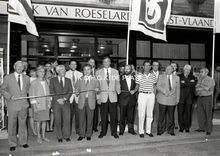 Zwart/wit foto Antony 190632-52. - Formaat : 24 x 30 cm. β Braderie op zondag 19 en maandag 20 juli 1932. Opening van de braderie op zondagmorgen door de enkele hoogwaardigheidsbekleders en de inrichters van de braderie. Op de foto zien we als derde van links Frans Devriendt (boekhandel Adolf Buylstraat), mejuffrouw Feraboli (koningin van de handel), burgemeester Edouard Moreaux, mevrouw De Meester, Schepen Verhaeghe, meneer (radio) Demeester. Op de achterste rij tussen burgemeester Moreaux en mevrouw De Meester staat Natan van βA la Ville de Londresβ