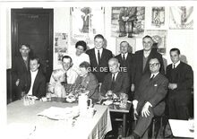 Zwart/wit foto Antony 40832-1. - Formaat : 24 x 30 cm. β De parlementaire en internationale handelsconferentie die in de loop van de week gehouden werd in het stadhuis bracht vertegenwoordigers van een twintigtal landen naar Oostende. Naar aanleiding van de bijeenkomst richtte Antoine DemouliΓ¨re in zijn hotel een banket in op vraag van Michelangelo Zimolo, consul-generaal van ItaliΓ« te Antwerpen en grote vriend van Oostende. Op de Β foto zie we enkele van deze afgevaardigden Β in de blauwe zaal van hotel Osborne, waar voor de gelegenheid gordijnen werden opgehangen met het logo van het hotel. De foto werd genomen na afloop van het banket als aandenken van een geslaagde bijeenkomst.