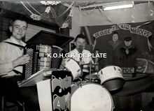 Formaat : 13 x 18 cm. - Op vrijdag 5 juli Feest bij de "Oude IJslandvaarders". Mevr. Wizer wordt gevierd voor haar 10 jaar meterschap, ze ontving hiervoor het erelint van de voorzitter. Er werd haar ook een geschenk aangeboden voor haar 75ste verjaardag
