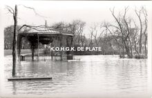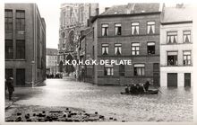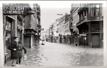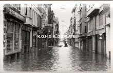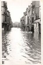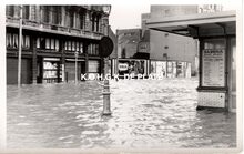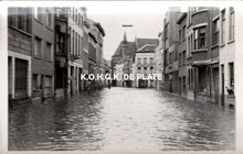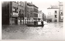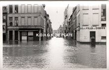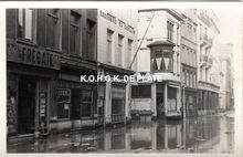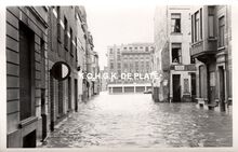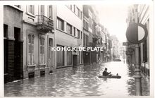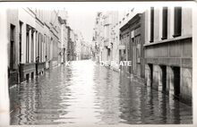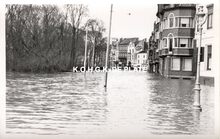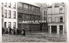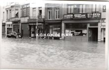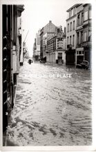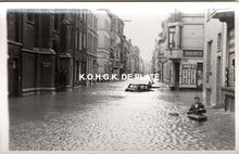 Formaat : 14 x 9 cm. - Recht voor u, de Pastoor Pypestraat met op de achtergrond de Sint Petrus en Pauluskerk. Links en rechts de Sint Franciscustraat. Links de Vrije Visserijschool Paster Pype. In de werkplaats op het gelijkvloers steeg het water tot op 0,50 meter hoogte, met aanzienlijke schade