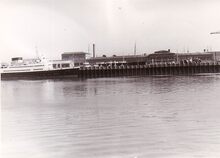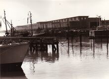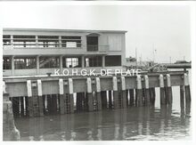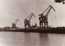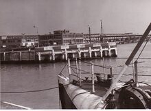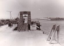 Foto 18 x 13. Laadbrug 1 Zeewezen." In de zomer van 1953 werden de landingsbruggen in Oostende en Dover in gebruik genomen. Voordien moesten de auto's gelost en geladen worden door middel van kranen." Ferdinand Gevaert. In : Vijfkwart Eeuw Male : 1845-1971. p.58. Plate Bib B508