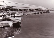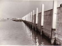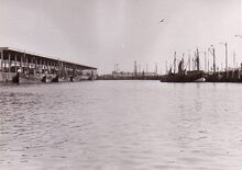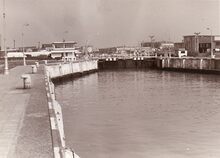 Foto 18 x 13. Haven tijdok. "Het tijdok loopt evenwijdig met het visserijdok en is bestemd voor de kleine vaartuigen. Het tijdok is 300 m. lang en 60 m. breed. Deze breedte vermindert geleidelijk naar het uiteinde om aldaar nog 30 m. te bereiken. Dit dok is gegraven op -2 m. en men beschikt er over 645 m. aanlegkaaimuur. Ten westen van de ingang van het tijdok werd een kuisbank aangelegd ten dienste van de kleine schepen" (niet zichtbaar op de foto). (Het havencomplex van Oostende, p.70) Plate bib B961