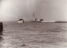 Foto 18x13. Havengeul met binnenvarend schip. Rechts het Ooststaketsel met de "tijseinpost". Tot 1983 werden de waterstanden in de haven visueel aangeduid aan de mast van dit gebouw. Men gebruikte daarvoor manden en kegels. Hierdoor kon worden afgelezen of het hoog of laag water was. Door de radiofonie heeft de "seinpost" deze functie verloren.