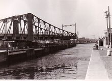 Foto : 18 x 13. Sluis in het Vlotdok, als toegang tot de Handelshaven. Gebouwd in de kom van de oude Franse spuikom. Eerste steenlegging op 19 juni 1898 door Koning Leopold II. Genoemd naar ir. P. De Mey, die de leiding heeft over de uitbreidingswerken van de haven tussen 1898 en 1914. De sluis is 178,10 m. lang en 18 m. breed. Over de sluizen heen worden in 1902-1903 twee stalen draaibruggen gebouwd, de Demeybrug en de Graaf de Smet de Naeyerbrug, beschermd als monument bij K.B. van 22/09/1981.