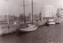 Foto : 18 x 13 cm. - Een gedeelte van het Houtdok en de houthandel Snauwaert gelegen langs de Houtkaai.