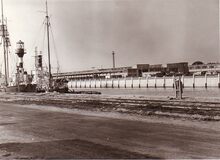 Formaat : 18 x 13 cm. Het Zeewezendok met lichtschepen. Het dok gezien vanaf de vismijnlaan. Op de achtergrond, de werkhuizen van het Bestuur van het Zeewezen