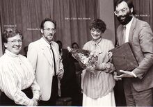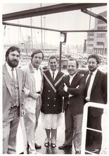 Een groepje vereremerkten in het stadhuis. Van links naar rechts Fred RIGAUX, hoofd dienst toerisme, Edward LAUWERS, journalist van de Zeewacht, POL SEGHERS, onbekende en Roger BOELS van de haringrokerij.