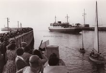 Op een zomerse namiddag vaart Β deΒ "Prinses JosΓ©phine-Charlotte" onder grote belangstelling de Oostendse haven in. Links het Weststaketsel en rechts, het Ooststaketsel met tijseinpost