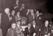 Een groep enthousiaste proevers rond een tonnetje wijn. Op de tweede rij rechts : Pierre Carlier en Raoul Maria Depuydt
