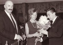 Op een feest van de loodsensportvereniging wordt mevrouw Marcel Friederichs in de bloemetjes gezet. Links staat Alfons Dekeyser, voorzitter van de vereniging.Β