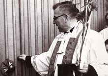 Pastoor E.H. PEEL opent voor het eerst de deur van zijn nieuwe kerk te Mariakerke aan de Lijsterbeslaan.
