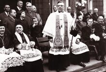 Pastoor PEEL wordt ingehaald in zijn nieuwe parochie Onze Lieve Vrouw te Mariakerke.Tweede van links deken RenΓ© BUTAYE,rechts op de eerste rij Jan PIERS,Kamiel DEHOUCK,achter PIERS,Louis VANHOORNE. Rechtstaande achter de pastoor en jongetje volksvertegenwoordiger Dries CLAEYS.